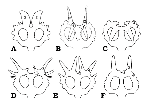 Schematized parietals of centrosaurine ceratopsids in dorsal view, showing possible homologies for the first four epiparietal loci. A. Alberta− ceratops nesmoi Ryan, 2007. B. Spinops sternbergorum gen. et sp. nov. C. Centrosaurus apertus Lambe, 1902. D. Styracosaurus albertensis Lambe, 1913. E. Rubeosaurus ovatus Gilmore, 1930. F. Einiosaurus procurvicornus Sampson, 1995. Numbers indicate locus positions. For A and B, the numbers on the right side of the parietal indicate numbering under the “traditional” scheme; numbers on the left side indicate numbering under the revised scheme proposed here. Locus numbering is the same in both the traditional and revised schemes for C, D, E, and F, and are thus presented only on the left side of the parietal for those taxa. Not to scale.