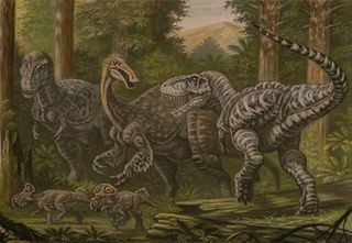 Dwa tarbozaury atakują deinocheira w późnokredowym, mongolskim lesie. Na dole po lewej dwa protoceratopsy, które znane są z nieco wcześniejszych osadów. Tytuł: Tarbosaurus, Deinocheirus, Protoceratops. Autor: ABelov2014. Źródło: http://abelov2014.deviantart.com/art/Tarbosaurus-Deinocheirus-Protoceratops-614898995 Licencja: Creative Commons Attribution 3.0 License. https://creativecommons.org/licenses/by/3.0/