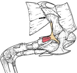 Mięśnie na barku i kończynie przedniej krokodyla. Kolorem zaznaczony jest mięsień trójgłowy ramienia, który przyczepia się do kości kruczej i łopatki (strzałka). Źródło: Delcourt, R., de Azevedo S.A.K. 2012. New information on the scapular musculature of Saturnalia tupiniquim (Dinosauria, Saurischia). Gaea - Journal of Geoscience, t. 8, nr 1, str. 1-5. doi: 10.4013/gaea.2012.81.01 Licencja Creative Commons Attribution 3.0.
