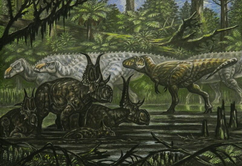 Dinozaury z formacji Wahweap. Grupa Diabloceratops zażywa kąpiel błotną. Do wędrującego stada Acristavus zbliża się Lythronax.