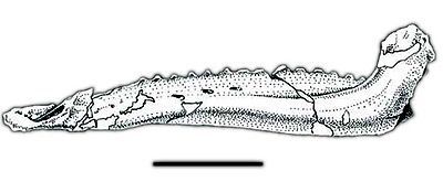 Ryc. 1. Holotyp Ratchasimasaurus suranareae (NRRU-A2064) - kość zębowa w widoku bocznym. Skala: 5 cm. © Shibata et al., 2011. | |||