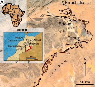 Lokalizacja osadów Kem Kem (na czarno), w których odnaleziono okazy Sigilmassasaurus. MHNM.KK376 został oznaleziony w pobliżu Jorf (zaznaczonego strzałką). Źródło: Hendrickx i in., 2016. | |