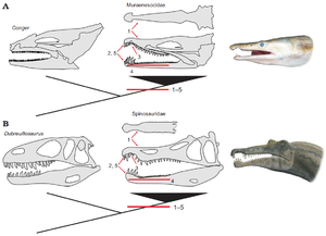 Vullo, R., Allain, R. & Cavin, L. (2016) "Convergent evolution of jaws between spinosaurid dinosaurs and pike conger eels" Acta Palaeontologica Polonica, doi:10.4202/app.00284.2016
