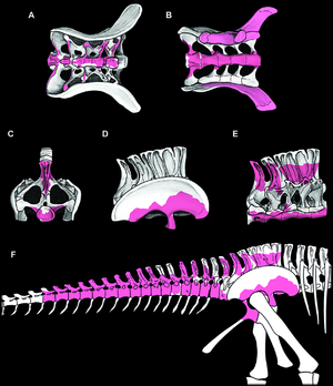 Miednica i ogon tatawiny. Kolorem zaznaczono zachowane elementy. A - sama miednica od góry, B - sama miednica od dołu, C - sama miednica od przodu, D - sama miednica z boku, E - same kręgi krzyżowe z boku, F - szkielet w okolicach bioder. Źródło: Fanti i in. 2013.