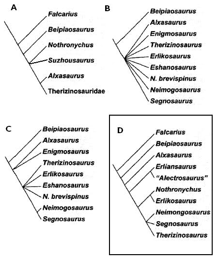 A - z Li i in., 2008 (na podstawie kolejno Li i in., 2007 z uzupełnionym Suzhousaurus - na podstawie Clark i in., 2004 z dodanymi Falcarius, Suzhousaurus i Erliansaurus i usuniętym Eshanosaurus),