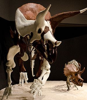 Wyniki badań rozmieszczenia czasowego Triceratops z formacji Hell Creek zostały opublikowane w 2014 r. przez Scannellę, Fowlera, Goodwina i Hornera. Wykazali oni, że w ewolucji Triceratops wydłużył się róg nosowy a skróciły rogi nadoczne. Zmieniła się też budowa pyska.