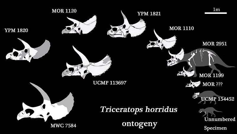 Ontogeneza Triceratops (identyfikacja większości okazów jako T. horridus jest wątpliwa, zob. wpisy poszczególnych okazach). Autor: "Laelaps nipponensis"/"GetAwayTrike".