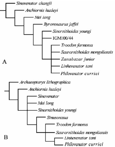 - >Troodon formosus ~ Velociraptor mongoliensis (Makovicky i Norell, 2004; zmodyfikowano z Sereno, 1998)