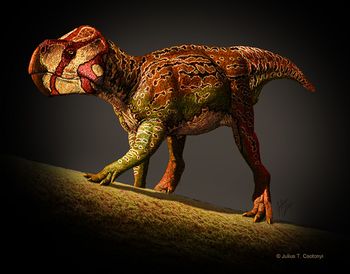 Rekonstrukcja Unescoceratops. Autor: Julius T. Csotonyi. [1]